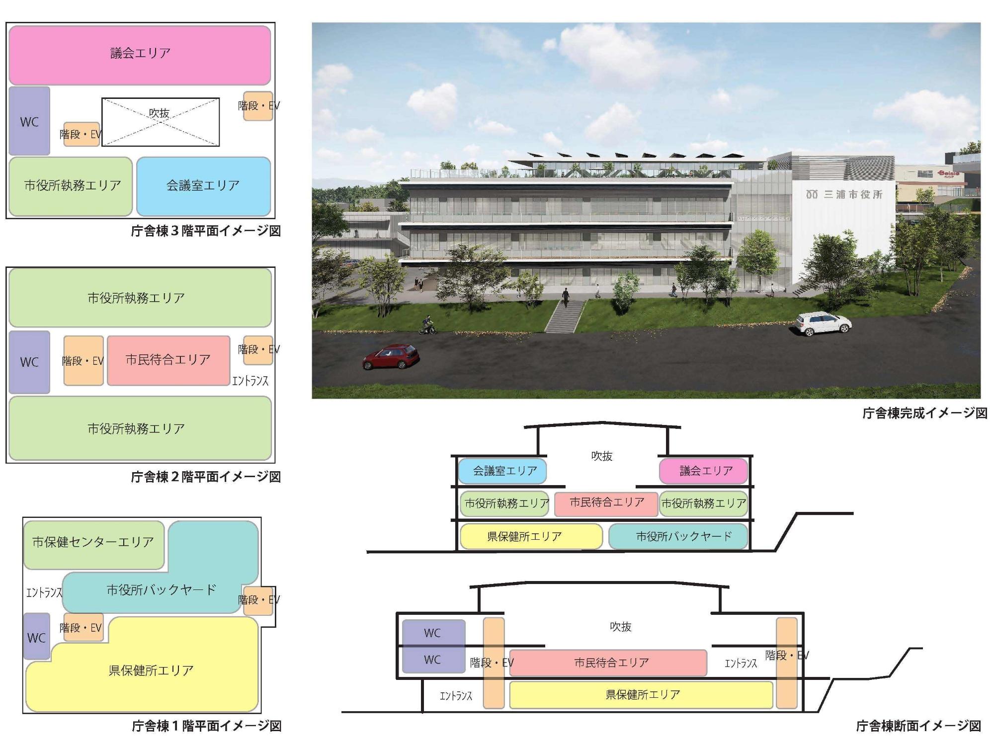 本事業では、市の中心となる県立三崎高等学校跡地(引橋B2地区)に、市役所本庁舎の移転整備とあわせて図書館、総合福祉センター等の公共施設を整備すると同時に、商業施設、集合住宅等の民間施設を導入することで、既設の消防署、商業施設などと相俟って市民交流の核となる市民交流拠点を整備することとしています。