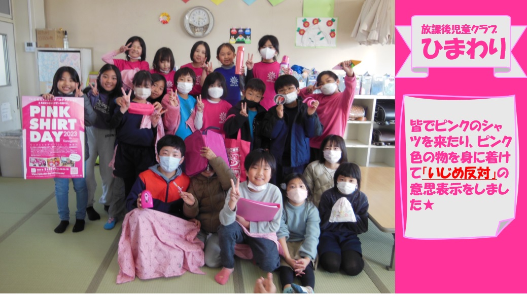 💛放課後児童クラブひまわりの皆さん💛みんなでピンクのシャツを着たり、小物を持ち寄ったりして、いじめストップの気持ちを表現しています。