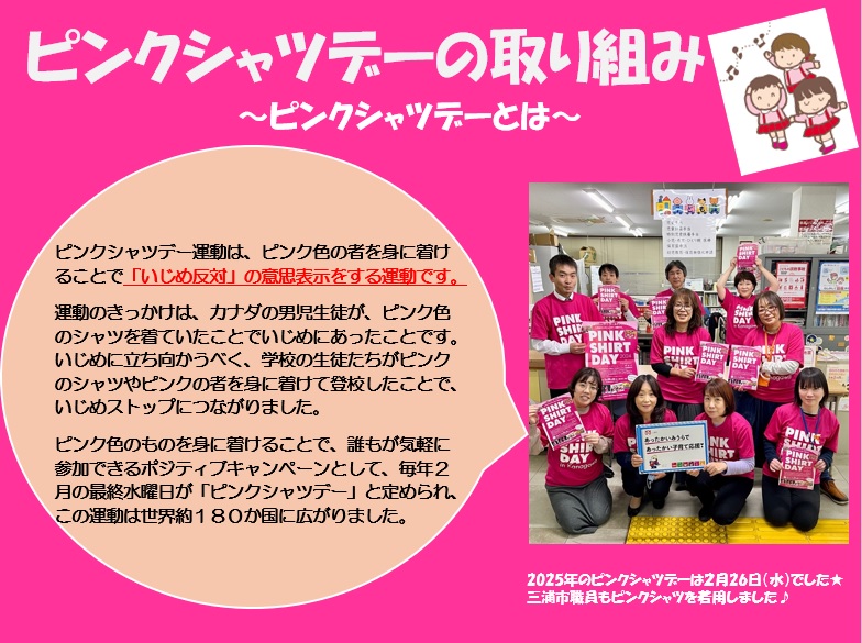 ピンクシャツデー運動は、ピンク色の物を身に着けることで「いじめ反対」の意思表示をする運動です。