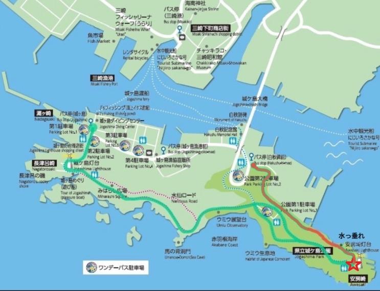 緑色で示したコース(ルート)が城ヶ島ハイキングコースです。