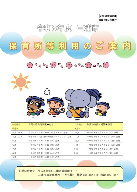 入所希望月の前月の15日までに三浦市福祉事務所(三浦市役所分館2階子ども課)で用紙を受け取り、申込みをしてください。