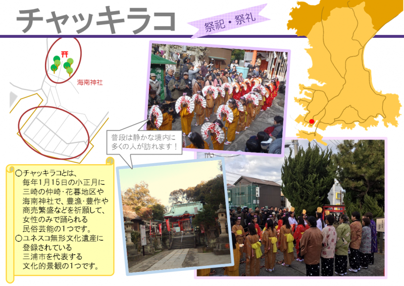 - チャッキラコは毎年1月15日の小正月に三崎の仲崎・花暮地区や海南神社にて、豊漁・豊作や商売繁盛などを祈願して、女性のみで踊られる民族芸能の1つです。