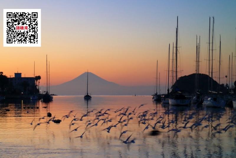 穏やかな港の遠景に富士山が見える写真 拡大画像 (JPEG: 190.1KB)