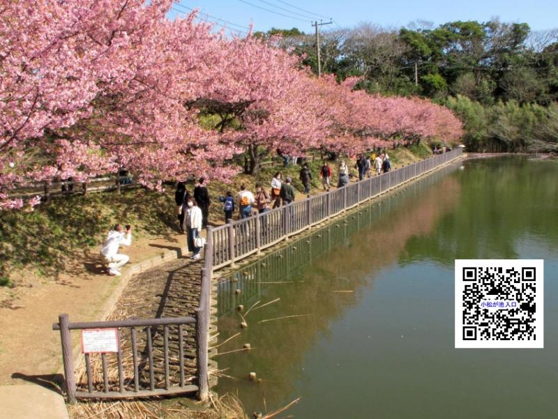 柵が張られた池のそばで歩きながら桜を楽しむ人達と右下にQRコードがある写真 拡大画像 (JPEG: 279.6KB)
