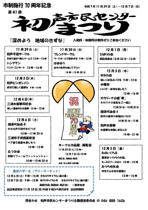 市制施行70周年記念 第41回初声市民センターまつり Tweet 更新日:2025年11月01日 ちらしはこちら (PDFファイル: 160.8KB) 関連リンク 続きを表示する スクロールすると続きが表示されます 続きを表示する みなさまのご意見をお聞かせください このページの内容は分かりやすかったですか わかりやすかったふつうわかりにくかった このページは見つけやすかったですか 見つけやすかったふつう見つけにくかった このページの内容は役に立ちましたか 役に立ったふつう役に立たなかった